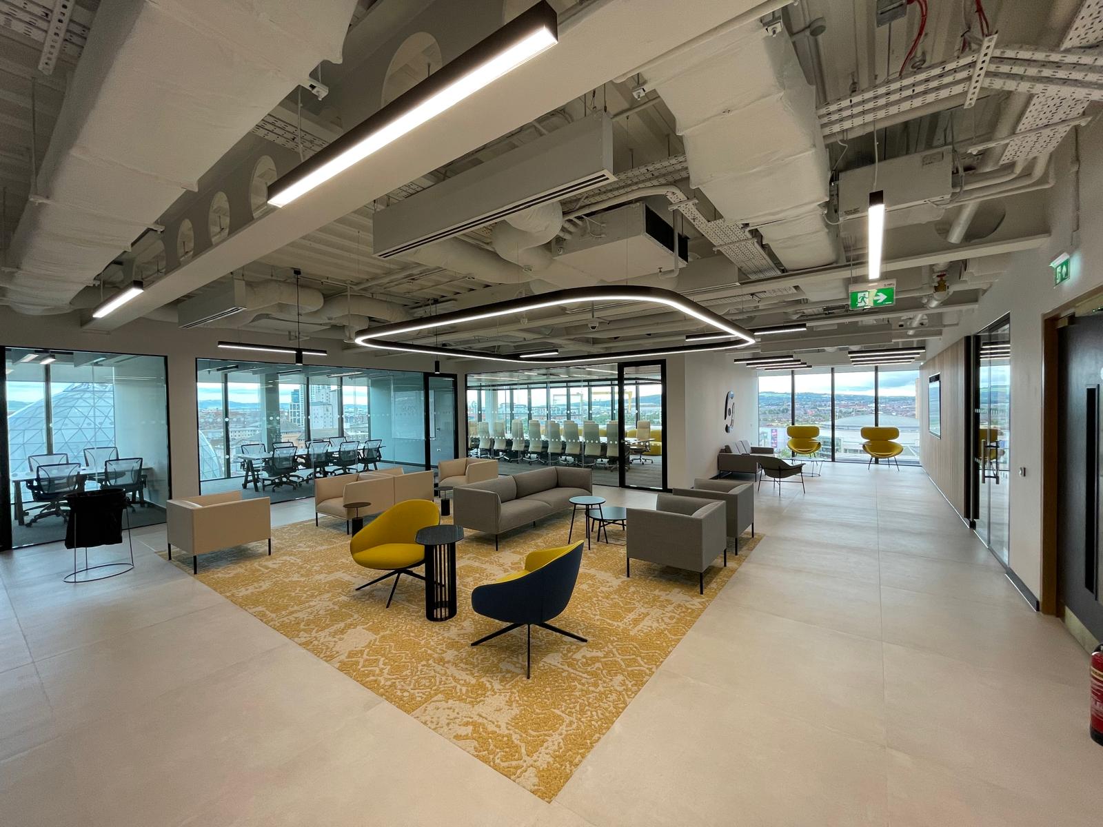 A new state of the art office situated within The Paper Exchange office block in the heart of Belfast. The facility includes a large open-plan seating area, boardrooms, breakout zones, kitchen and relaxation areas, bicycle racks, shower facilities, and locker rooms.